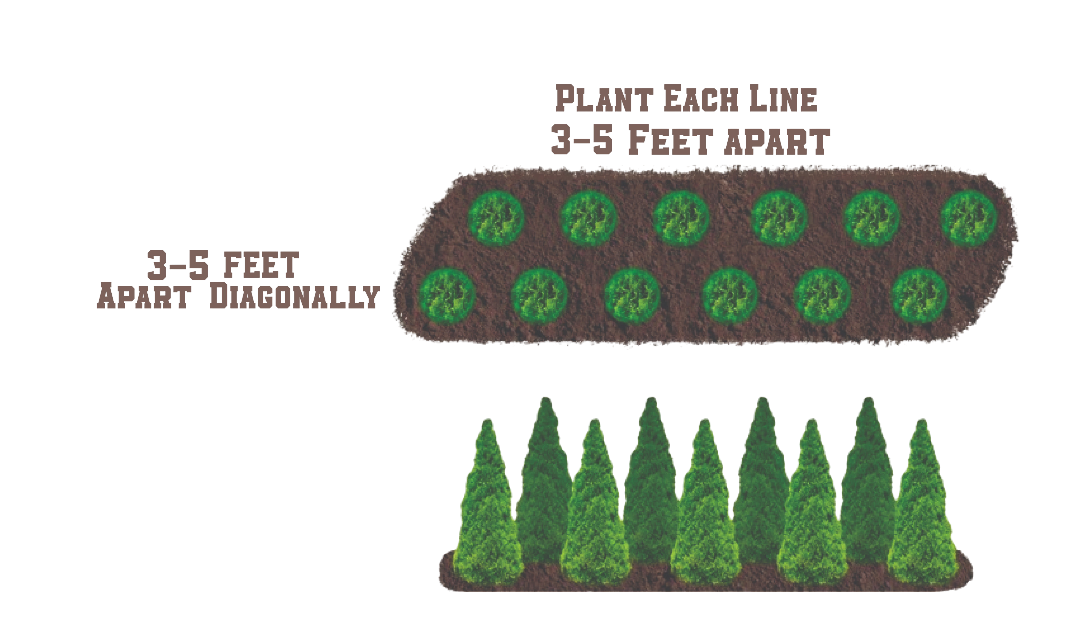 This method provides for a quicker and more densely packed screen than planting in a straight row. It involves making a double row, with plants growing in the ground diagonally to one another. The rule of thumb here is to space your plants 3-5 feet apart horizontally with around a 3-5 foot gap between the two rows.