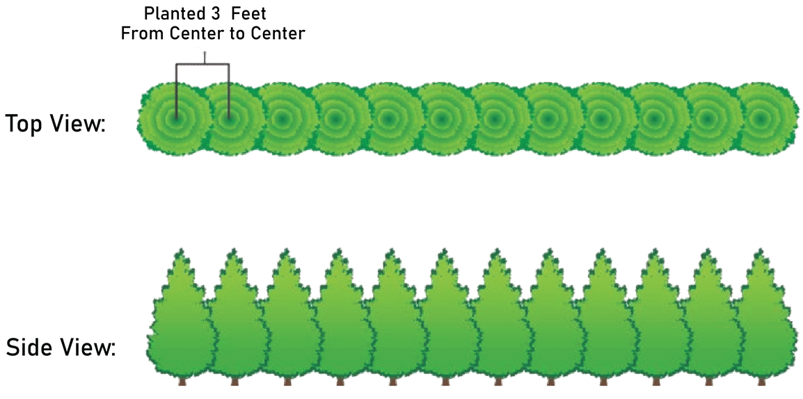 This method provides for a quicker and more densely packed screen than planting in a straight row. It involves making a double row, with plants growing in the ground diagonally to one another. The rule of thumb here is to space your plants 3-5 feet apart horizontally with around a 3-5 foot gap between the two rows.